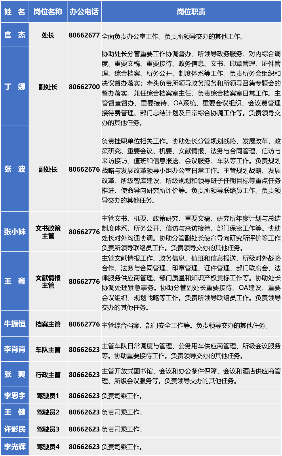 负责协助组织所务会、所领导政务服务、重要工作协调督办、紧急事务协调处理、对外沟通协调、对内综合调度、规划战略、发展改革、政策研究、重要文稿、重要会议、重要接待、政务信息、文书、机要、工作秘密管理、印章管理、证件管理、综合档案、法务、所务公开、文献情报、信访与来访接访、会议服务、车队等工作。负责领导交办的其他任务。