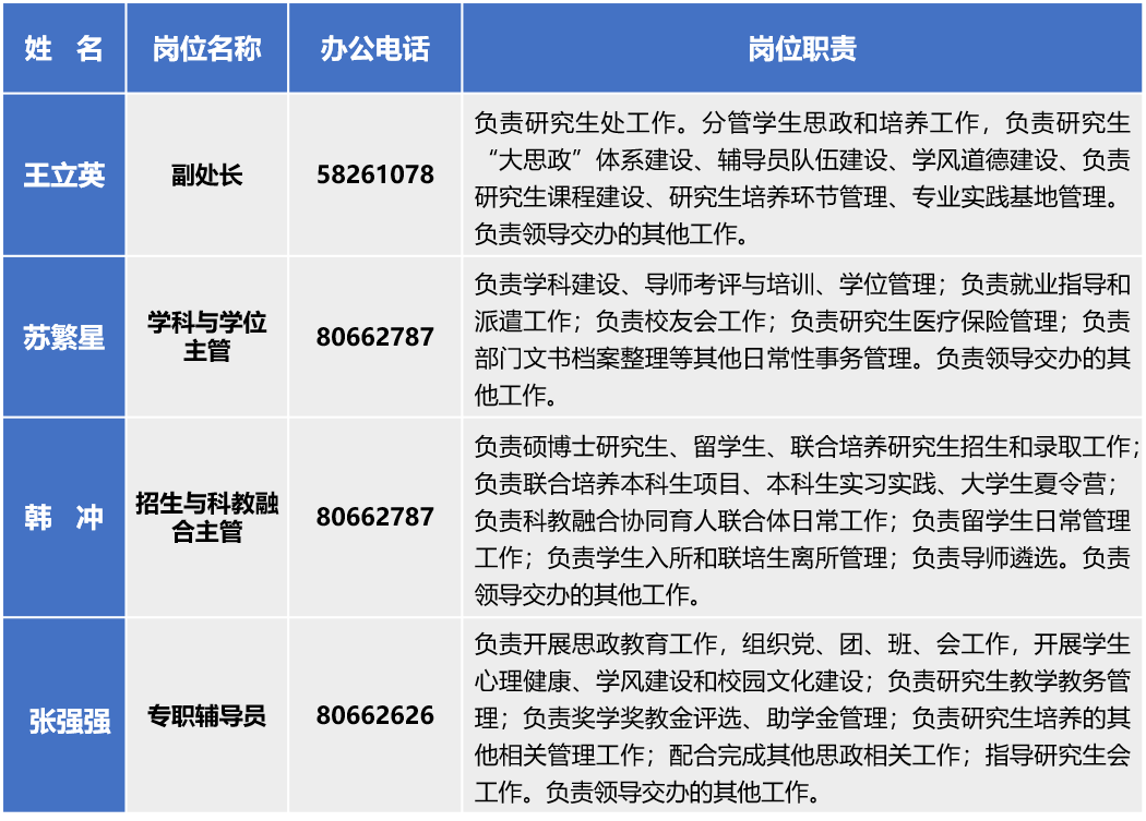 负责招生、培养、学位与就业、科教融合、学科建设等工作。负责学位委员会日常工作。负责领导交办的其他任务。