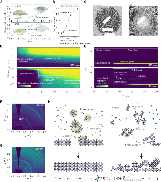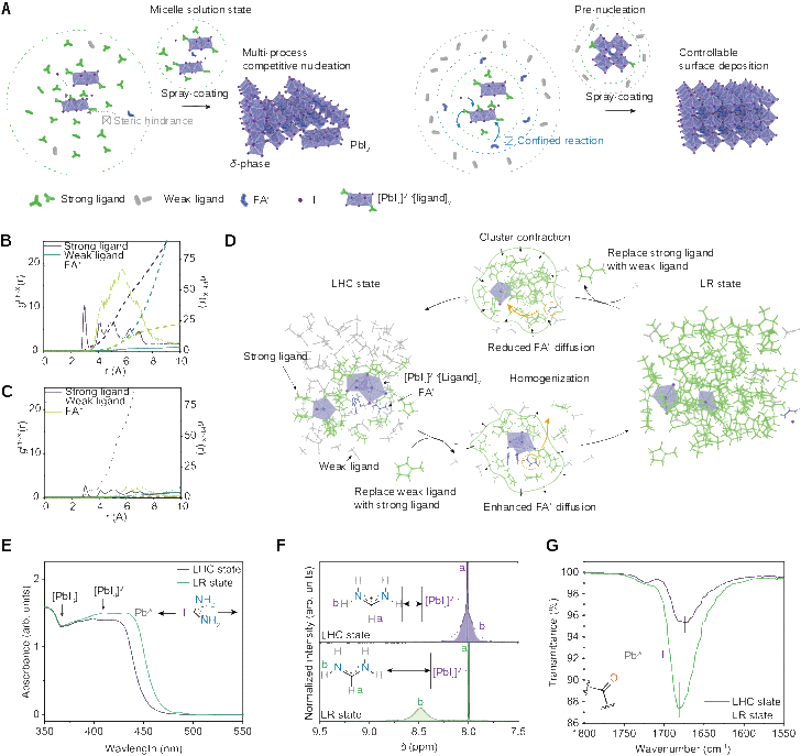 相比之下,喷涂法(spray coating)因其快速、可规模化以及对复杂三维结构表面沉积高度兼容的优势,在建筑一体化光伏、交通工具表面以及多层结构器件的制备中极具潜力。然而,喷涂过程中钙钛矿前驱体液滴复杂的结晶动力学带来的高缺陷态密度,限制了其制备高光电性能器件。传统溶剂挥发过程缓慢、前驱体中各组分析出驱动力不一致以及层层沉积引发表层反复腐蚀,导致喷涂制备的钙钛矿薄膜往往存在相杂质多、晶粒取向无序和缺陷密度高等问题,其器件性能长期显著落后于旋涂等工艺。