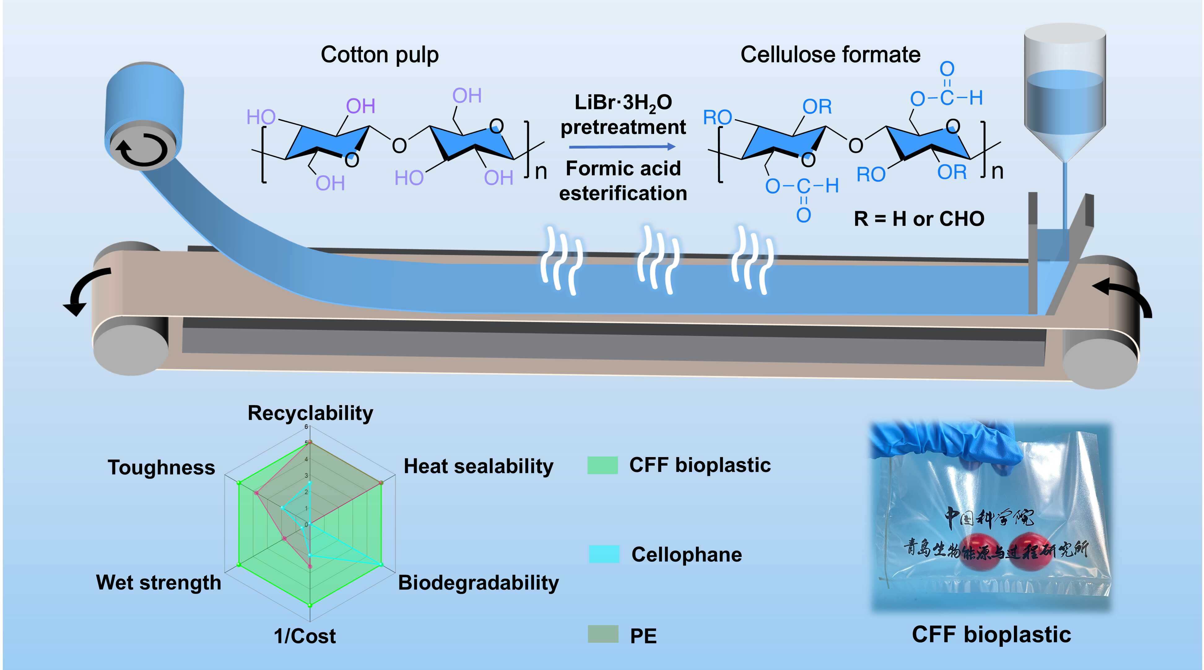 近日,青岛能源所系统集成工程中心木质纤维绿碳材料项目部,在前期对木质纤维素熔盐水合物预处理及相关功能材料开发的基础上,通过绿色、温和的熔盐水合物预处理及酯化反应,开发了兼具高取代度和高聚合度的纤维素甲酸酯,通过流延法获得的纤维素甲酸酯生物塑料薄膜(CFF)展现出良好的耐水性和热封性。与传统的纤维素基玻璃纸原纸和石油基聚乙烯(PE)薄膜相比,这种CFF生物塑料具有更高的拉伸强度(128 MPa)和韧性(1485 J/m3),其湿强度(72.9 MPa)优于大多数已报道的纤维素基生物塑料膜。由于预处理和酯化取代导致的去结晶化,这种CFF生物塑料还表现出独特的热封性,其热封强度(1953 N/m或61 MPa)显著高于所有已报道的纤维素生物塑料。此外,CFF生物塑料膜出色的包装性能,包括对水蒸气、空气和油的高阻隔性、高透明度、良好的印刷适性和抗菌性能,满足高质量纤维素基包装薄膜的应用需求。
