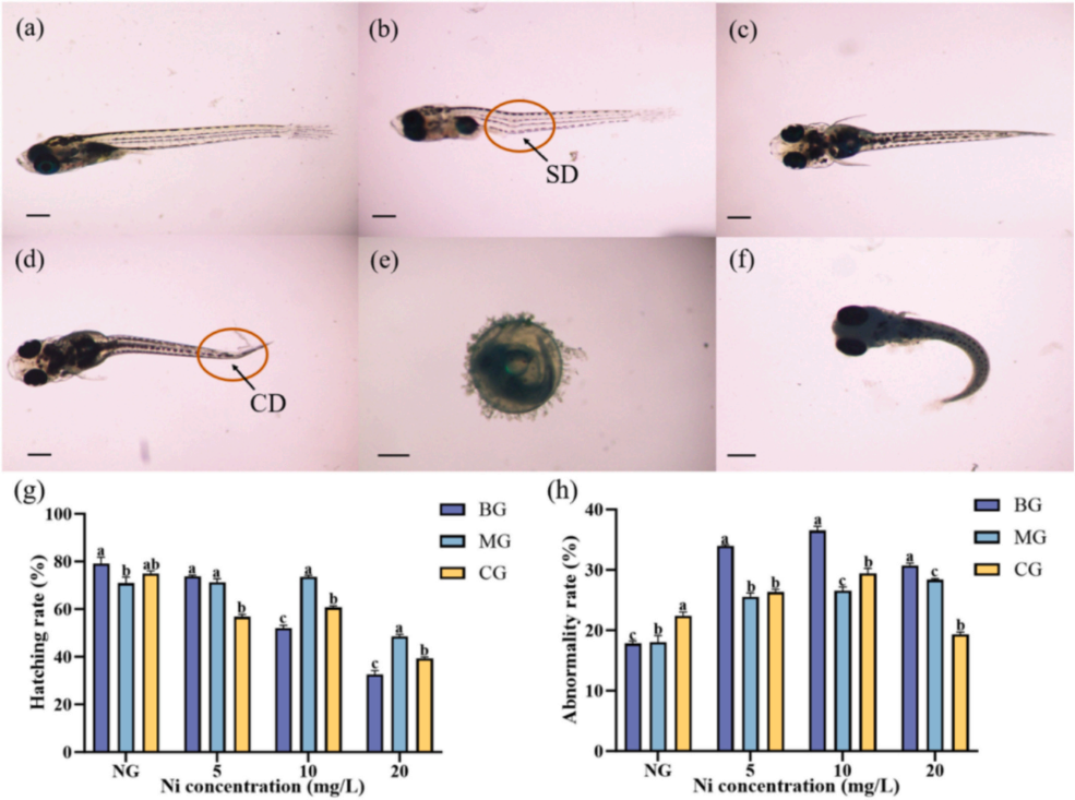 此外,为评估麦可藻对鱼胚胎的保护作用,研究人员构建了镍(Ni)致畸模型。结果显示,麦可藻组海水青鳉胚胎死亡率为51.99%,低于小球藻组的60.20%和人工饲料组的66.27%;胚胎孵化率为48.01%,显著高于小球藻组的39.80%和人工饲料组的33.73%(图3)。研究推测,麦可藻富含神经酸,可通过促进神经细胞修复、提供关键营养物质等途径,有效减轻不利环境因素对胚胎发育的负面影响。