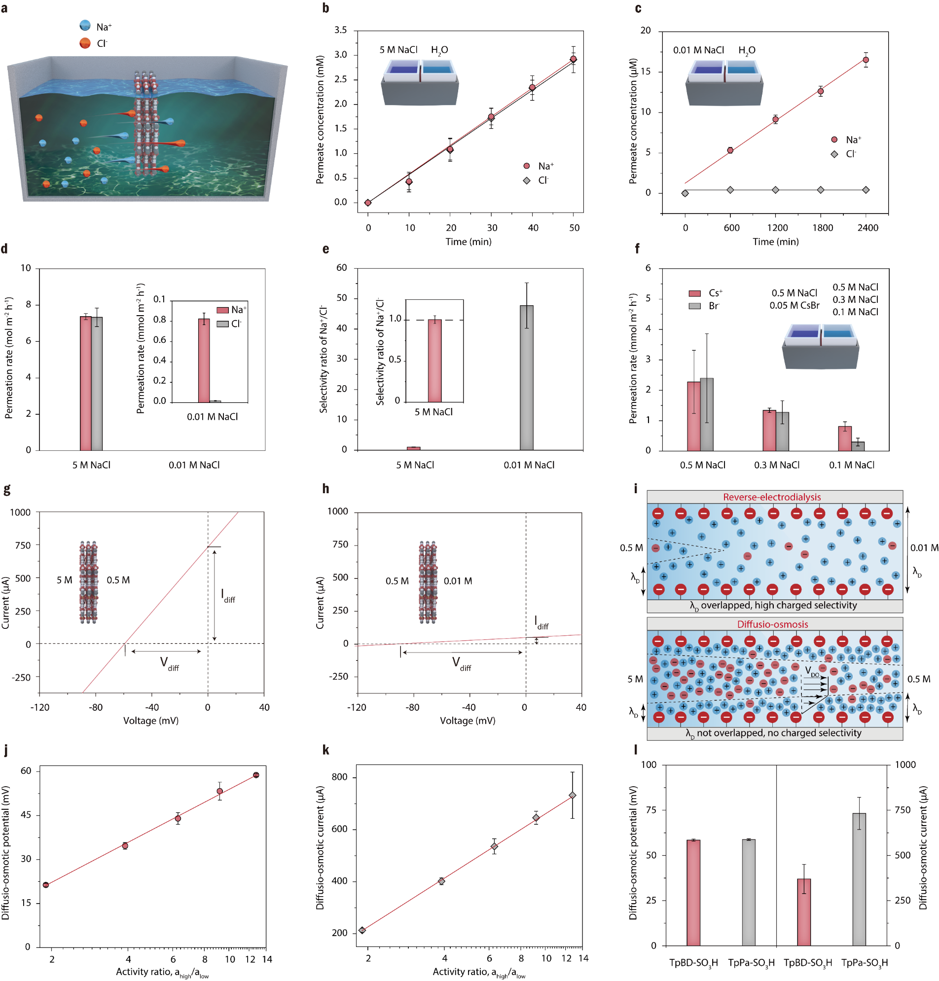 针对上述问题,青岛能源所高军研究员与山东大学刘鹏教授合作,提出了一种利用扩散—渗透(diffusio-osmosis)机制来收集盐差能的新方法,不同于选择性机制的RED技术,该机制产生的电流源于双电层内界面渗透压梯度驱动的扩散—渗透流携带的净电荷,不依赖膜材料的离子选择性。