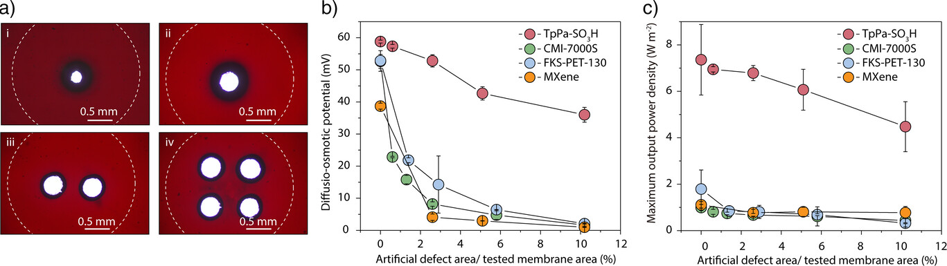 在5 M/0.5 M NaCl浓度梯度下,由于COF通道内的德拜长度(λD)不重合,因此该膜不具备电荷选择性,Na+和Cl-的渗透测试进一步验证了这一结论。此外,扩散—渗透电流与活度比的对数呈线性关系,表明扩散—渗透机制主导了盐差能转换过程。此过程中,COF致密分布的磺酸基团提供了高电荷密度,增强了电双层内界面渗透压梯度从而能有效产生扩散—渗透流,结合其垂直排列的一维孔道,能高效驱动离子输运。避免了传统RED对选择性的依赖,克服了“通量—选择性”博弈和浓差极化等问题。在0.03 mm2测试面积下,实现了101.2 W m-2的最大功率密度,显著高于多数已报道材料。当膜面积放大两个数量级(~20 mm2),功率密度仍能维持在~7 W m-2。这一新机制的优势在于不依赖膜材料的离子选择性,使得体系表现出前所未有的抗缺陷能力,即便在膜上引入超过测试面积10%的针孔缺陷,仍能维持稳定的输出电压与输出功率,而传统RED膜在类似条件下几乎完全失效。这一发现显著提高了膜材料的制备容错度,有望降低膜材料的制造成本并提高其工程化应用的可行性。