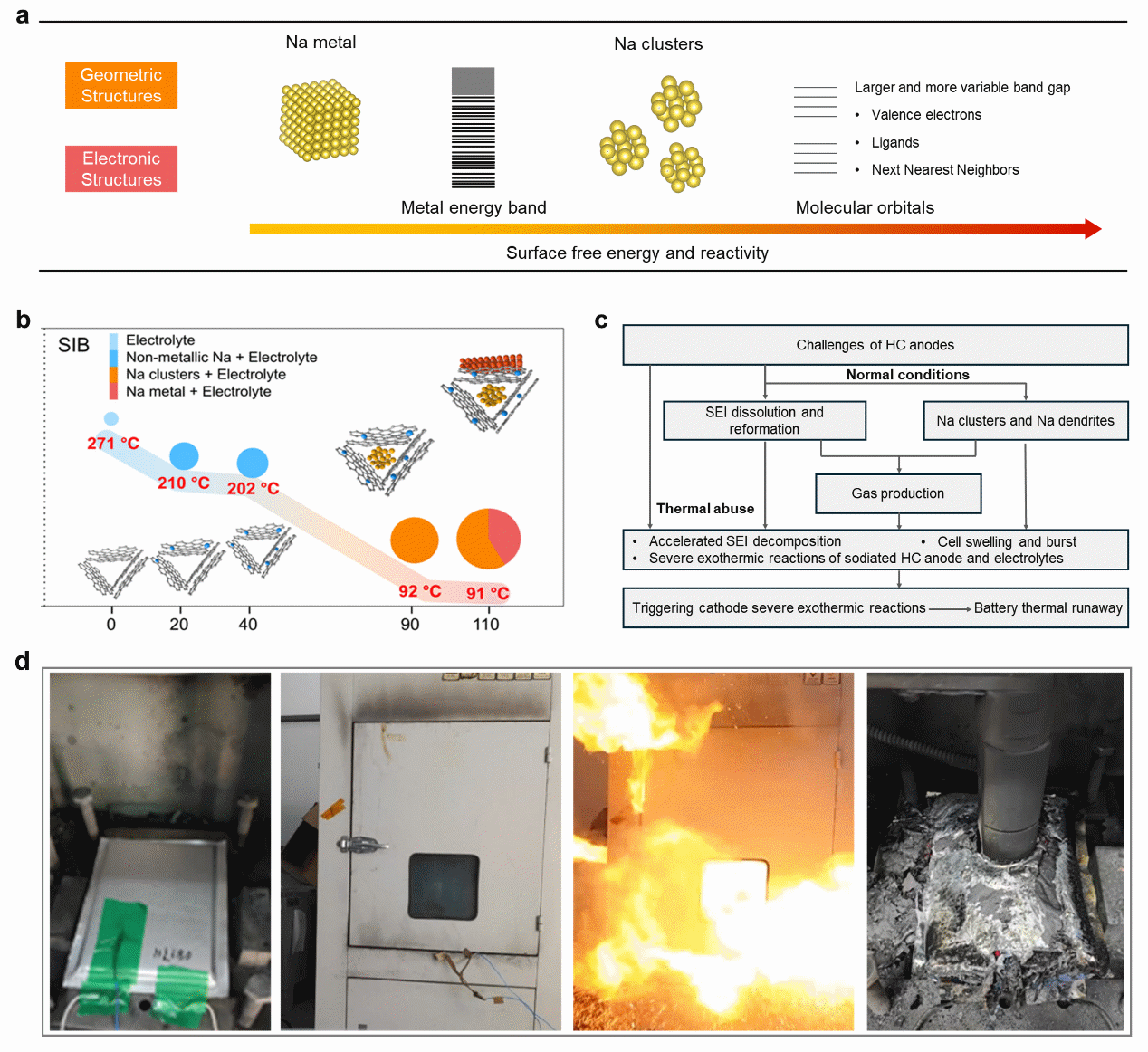 钠离子电池作为锂离子电池的有力补充与潜在替代技术,近年来受到广泛关注。学术界和产业界普遍认为,钠离子电池在能量密度较低、电极材料热稳定性高的前提下,其安全性应当优于锂离子电池。然而,青岛能源所固态能源系统技术中心在系统研究中发现,这一认识并不完全正确。在常规电池体系下,钠离子电池同样存在显著的安全隐患,其热失控风险甚至高于锂离子电池。根源在于硬碳负极中形成的准金属态高活性钠簇,可诱发电解液剧烈分解并触发热失控的链式反应。