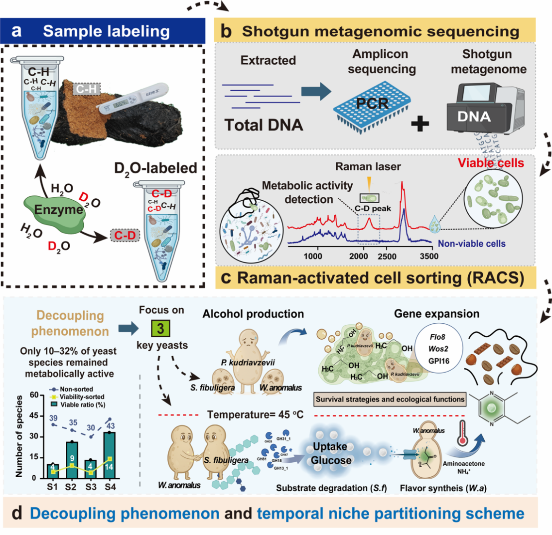 针对上述难题,江南大学徐岩教授团队张丽杰课题组和青岛能源所单细胞中心荆晓艳副研究员带领的研究小组基于中心开发的拉曼微流单细胞分选仪,在高温大曲单细胞拉曼分选服务菌群机制解析和原位功能菌资源挖掘等方面取得重要进展。研究团队首先建立了适配于高温大曲的群落稳定同位素示踪、拉曼光谱鉴定及单细胞分选技术,对高温大曲发酵过程中酵母菌的原位活性状态及其代谢活力进行了准确定量和精准分选。结果显示,在高温胁迫条件下,通过测序检测到的酵母物种中,仅有约10%–32% 仍保持代谢活性。酵母菌在高温大曲中存活比例的定量结果表明,微生物在群落中的“数量及多样性”并不等同于其在发酵过程中的“功能”。