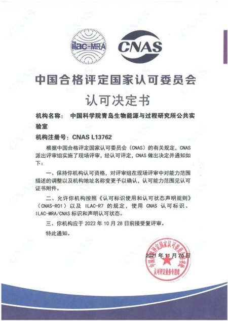 近日,青岛能源所公共实验室成功通过由中国合格评定国家认可委员会(CNAS)组织的监督评审,获得了由CNAS颁发的认可决定书(注册号CNAS L13762)。这标志着公共实验室的认可资格获得保持,技术能力持续符合ISO/IEC 17025:2017《检测和校准实验室能力的通用要求》和CNAS-CL01《检测和校准实验室能力认可准则》要求。