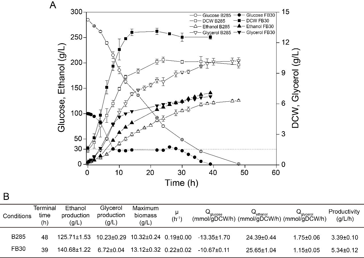 乙醇作为一种清洁可再生能源,在工业生产中通常通过分批发酵获得。由于高糖浓度条件往往会诱导酵母细胞产生渗透压及氧化应激反应,抑制乙醇合成并增加副产物甘油的生成,从而限制乙醇的生产效率。近日,青岛能源所智能生物制造研究组王冠副研究员通过多组学联合分析,揭示了在精准控制葡萄糖浓度条件下,酿酒酵母如何优化资源分配,显著提高乙醇产量的分子机制。