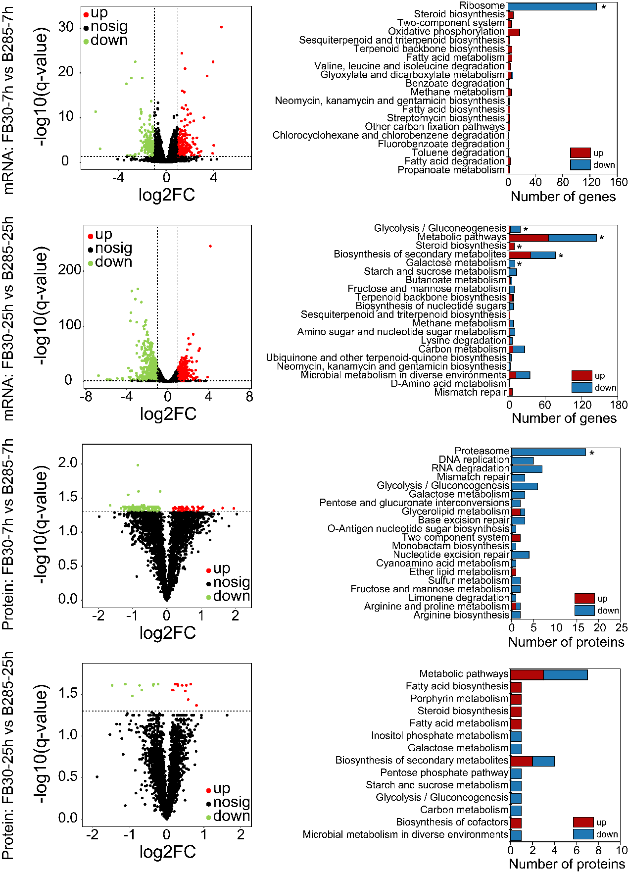 研究结果显示,在葡萄糖控制的补料分批发酵条件(FB30)下,核糖体相关基因及蛋白酶体蛋白显著下调(图2),表明细胞通过降低蛋白合成与降解速率,减缓了蛋白质周转,从而节约了大量能量与前体物质。这一代谢重编程行为被认为是细胞资源优化分配的关键策略,即减少维持性代谢消耗,将更多代谢资源投入到生长与产物生成之中。