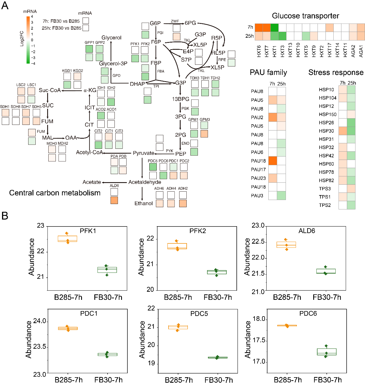 进一步分析发现,在精准控糖条件(FB30)下,酵母细胞通过下调糖酵解关键酶基因(如PFK、PDC)及甘油合成途径基因(GPD1、GPP1/2),显著减少了乙酸和甘油等副产物的生成,从而将更多碳流导向乙醇合成。同时,细胞上调高亲和力葡萄糖转运蛋白(HXT6/7)及其辅助蛋白AGA2的表达,增强了低糖环境下的底物摄取能力。应激响应层面,PAU基因家族在高乙醇浓度下被激活,而热休克蛋白、海藻糖合成以及氨基酸和糖醇类抗逆代谢途径相关基因的表达则显著下调。这表明,酵母在精准控糖环境中有效避免了高糖应激,维持了代谢稳态,促进了乙醇的高效积累(图3)。