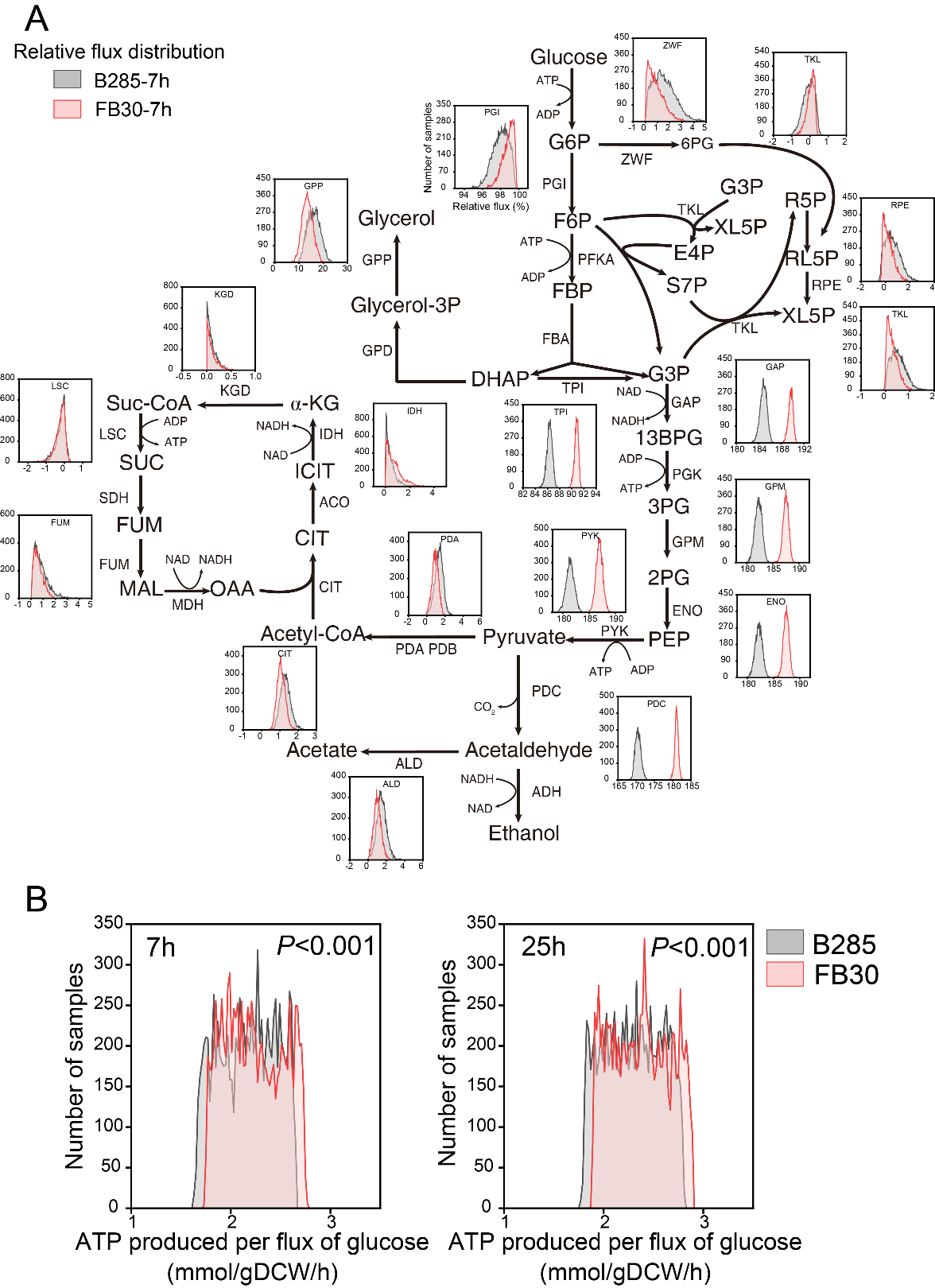 代谢通量分析结果进一步表明,葡萄糖受控条件(FB30)下,更多碳流经糖酵解途径生成ATP和NADH(图4)。在减少高糖应激导致的能量消耗与副产物合成的同时,酵母将过量NADH通过乙醇生成反应高效消耗,维持了细胞的氧化还原平衡,从而促进乙醇生成速率与产量的双重提升。