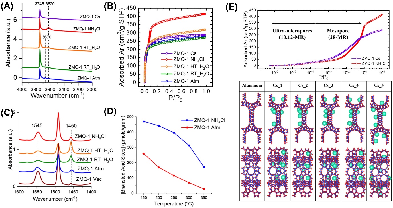 针对上述问题,分子筛材料研究组联合法国卡昂大学、保加利亚索非亚大学等国际合作团队,首次系统阐明了新型介孔沸石ZMQ-1中残余磷物种对材料酸性和孔道性质的影响机制,并成功实现了对其酸性位点的精准调控。这一发现为设计高效大分子催化材料提供了新的思路,有望推动沸石催化剂在大分子转化领域的应用。研究团队综合运用固体核磁共振、原位红外光谱、氩气物理吸附和密度泛函理论计算等多种手段,系统考察了不同处理条件对ZMQ-1性质的影响。发现动态真空焙烧可去除约90%的残留磷,而常规空气焙烧则无法有效除磷。对于常规焙烧后的ZMQ-1,采用氯化铵或硝酸铯溶液进行后处理洗涤,可去除超过90%的残留磷,并将磷配位的八面体铝恢复为四面体骨架铝;而纯水洗涤只能去除约70%的磷,且伴随明显的铝流失。在此基础上,团队首次测定了吡啶和2,6-二叔丁基吡啶在ZMQ-1上的摩尔消光系数,为酸性位点的准确定量奠定了基础。实验表明,无磷ZMQ-1中所有Brønsted酸性位点均可被探针分子接近,而残留磷的存在使可及性大幅下降。DFT计算进一步揭示了铝原子优先占据双10元环区域,且Brønsted质子倾向于朝向28元环介孔通道取向,这一预测得到了铯离子交换后孔体积变化的实验验证。