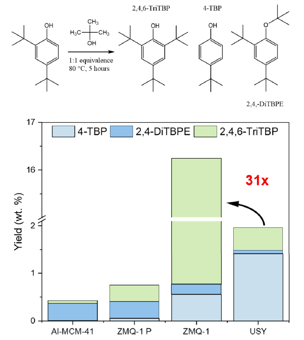 催化性能测试以大体积的2,4-二叔丁基苯酚与叔丁醇的烷基化反应为模型,结果显示,无磷ZMQ-1对目标产物2,4,6-三叔丁基苯酚的收率达到15.5%,比工业常用的多级孔USY沸石(0.5%)提高了31倍,也远超无定形孔壁的Al-MCM-41。这一优异性能归因于ZMQ-1规整的10/12元环窗口级晶体介孔结构,其能够稳定大体积过渡态是无定形材料无法实现的。该研究不仅为ZMQ-1的催化应用奠定了坚实基础,也为其它基于磷模板剂合成的超大孔沸石的结构优化和性能调控提供了系统性的研究范本。随着精细化工和生物质转化等领域对大分子催化需求的不断增长,ZMQ-1这类兼具沸石酸性和介孔可及性的新材料有望发挥越来越重要的作用。