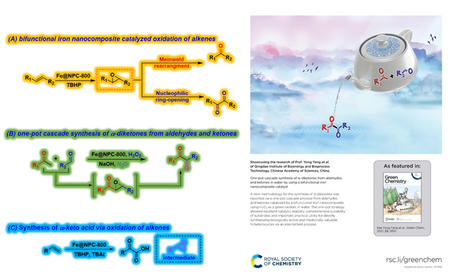 (2) One-Pot Cascade Synthesis of α-Diketones from Aldehydes and Ketones in Water Catalyzed by A Bifunctional Iron Nanocomposite Catalyst. Green Chem. 2021, 23, 1955-1959. Tao Song, Xin Zhou, Xiaoxue Wang, Jianliang Xiao, Yong Yang* https://pubs.rsc.org/en/content/articlelanding/2021/gc/d0gc03739g#!divAbstract