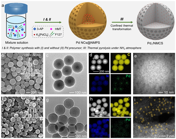 图1. 氮掺杂介孔碳球负载Pd单原子催化剂的制备流程图以及电镜表征图:(b-e) Pd-NCs@NMPS;(f-i) Pd1/NMCS