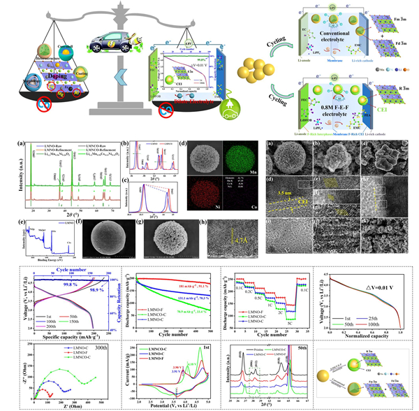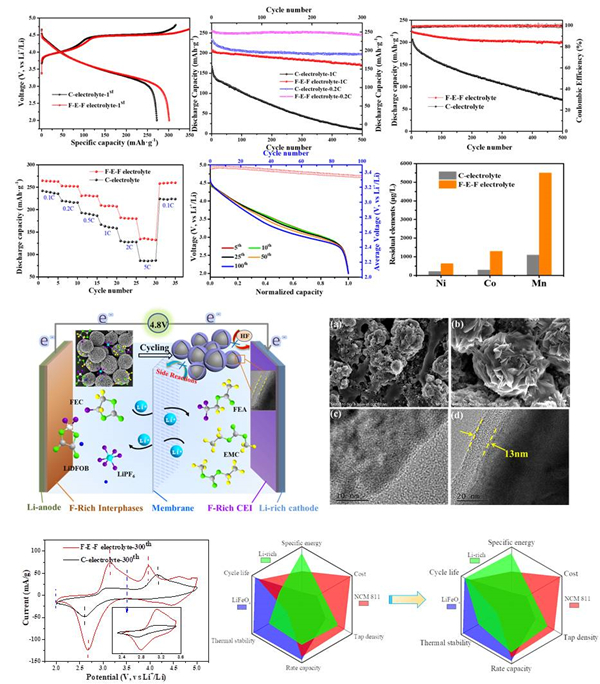 在高镍三元LiNi0.8Co0.15Al0.05O2(NCA)正极材料方面,研究团队巧妙设计,通过由内而外修饰方法成功开发出一种氧化铝包覆的镁掺杂NCA(Al2O3@Mg/NCA)体系。以该方式构建的NCA材料具有稳定的内部结构,通过抑制材料内部相变和阳离子掺杂,在抑制副反应发生的同时实现了体系内部快速的电子传输。在1C的倍率下,电池历经250次循环,容量仍能保持在95%以上。该工作为NCA材料的商业化道路奠定了基础,也为动力电池正极材料的设计与改性提供了新的发展思路。随着电动汽车对高能量密度电池需求的增加,包括NCA在内的部分正极材料的能量密度已不能满足需求,严重限制了纯电动汽车的续航里程。富锂锰基正极材料因其高比容量、高能量密度、低成本等优点,非常适合用于新一代高能量密度锂离子动力电池。但是其材料自身低首效、循环及倍率性能差、电压衰降严重的本征缺陷,以及缺乏相匹配高压电解液等问题制约了商业化应用和发展。研究团队独辟蹊径,通过电解液一步法原位改性,成功开发出一种全性能富锂锰基电池体系相关研究,结果发表在ACS Applied Materials & Interfaces《应用材料与界面》。通过SEM/TEM/XPS/ICP-AES等一系列测试,证实在正负极表面原位包覆形成了含氟的坚固致密CEI保护膜,既稳定了正极材料结构,又抑制了电解液分解对正极材料造成的腐蚀,有效减少了金属离子的溶出,从而大幅提升富锂锰基正极材料的综合电化学性能。改性后的富锂正极材料首次放电比容量达到300mAh·g-1,在0.5C倍率下经过500次充放电循环后容量保持率高达88%。同时,电池循环过程中的电压衰降也得到很好的改善,为富锂锰基正极材料的改性和商业化应用提供了新的思路(图1)。