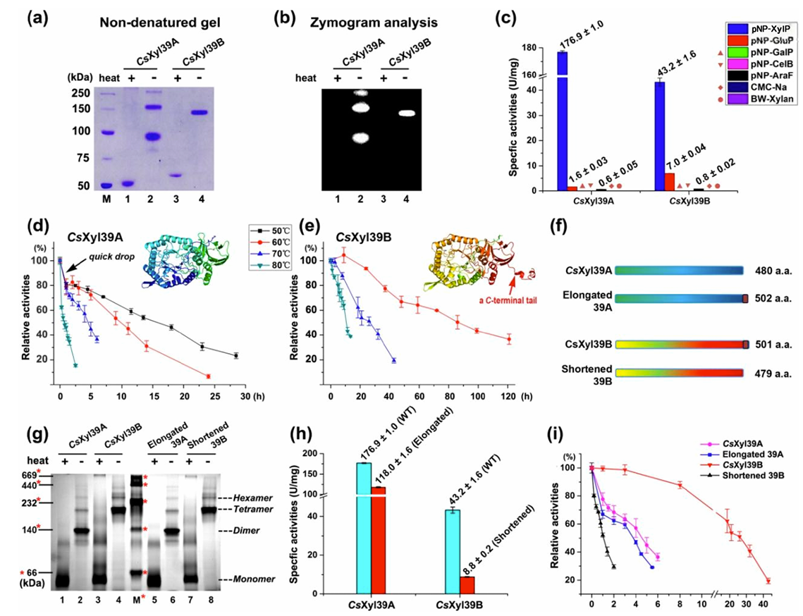 在此基础上,团队通过结构预测与定点突变,首次揭示了C端α-螺旋短尾(sHT)是调控GH39家族β-木糖苷酶四聚体稳定性与热稳定性的关键结构元件,这一发现为糖苷水解酶的蛋白质工程改造、热稳定性定向提升提供了全新的靶点与理论依据。