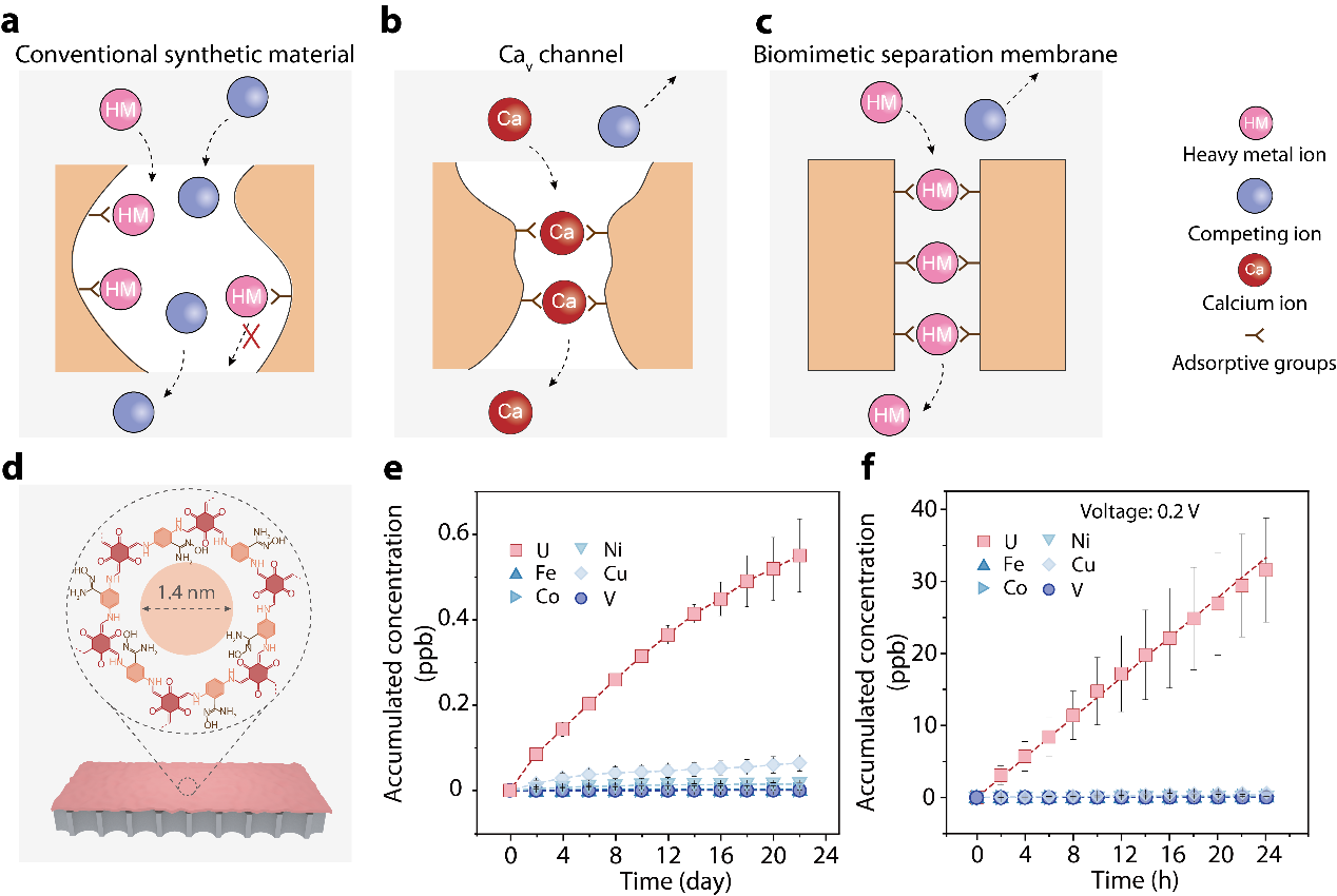 图1受生物通道启发的关键金属离子分离膜构建策略示意图及铀提取性能。(a)传统分离膜,被吸附的离子无法传输;(b)生物钙离子通道,被吸附的钙离子优先传输;(c)仿生分离膜,被吸附的关键金属离子优先传输,实现关键金属离子选择性分离提取;(d)材料分子结构;(e)海水中铀的分离提取性能;(f)电场驱动下海水中铀的分离提取性能。